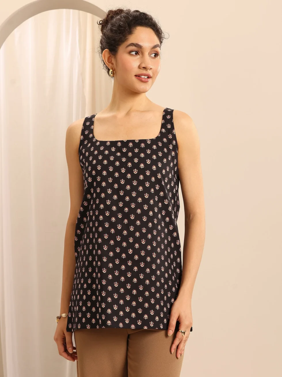Our 1-piece black cotton straight-fit kurta features a square neckline and statement Yoke. Adorned with floral printed embellishments, this style is perfect for casual wear.