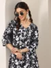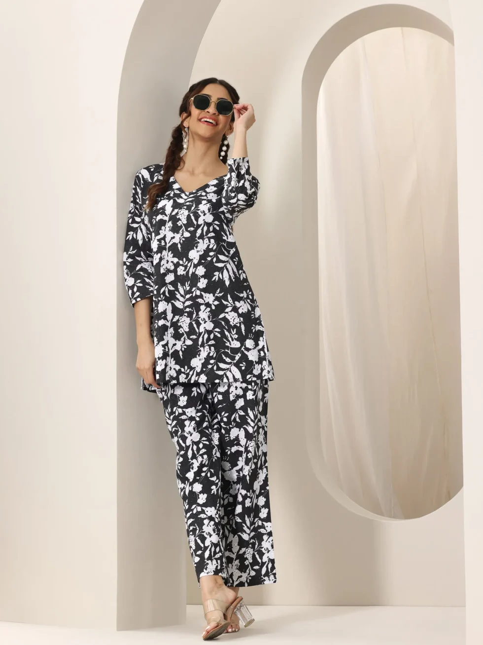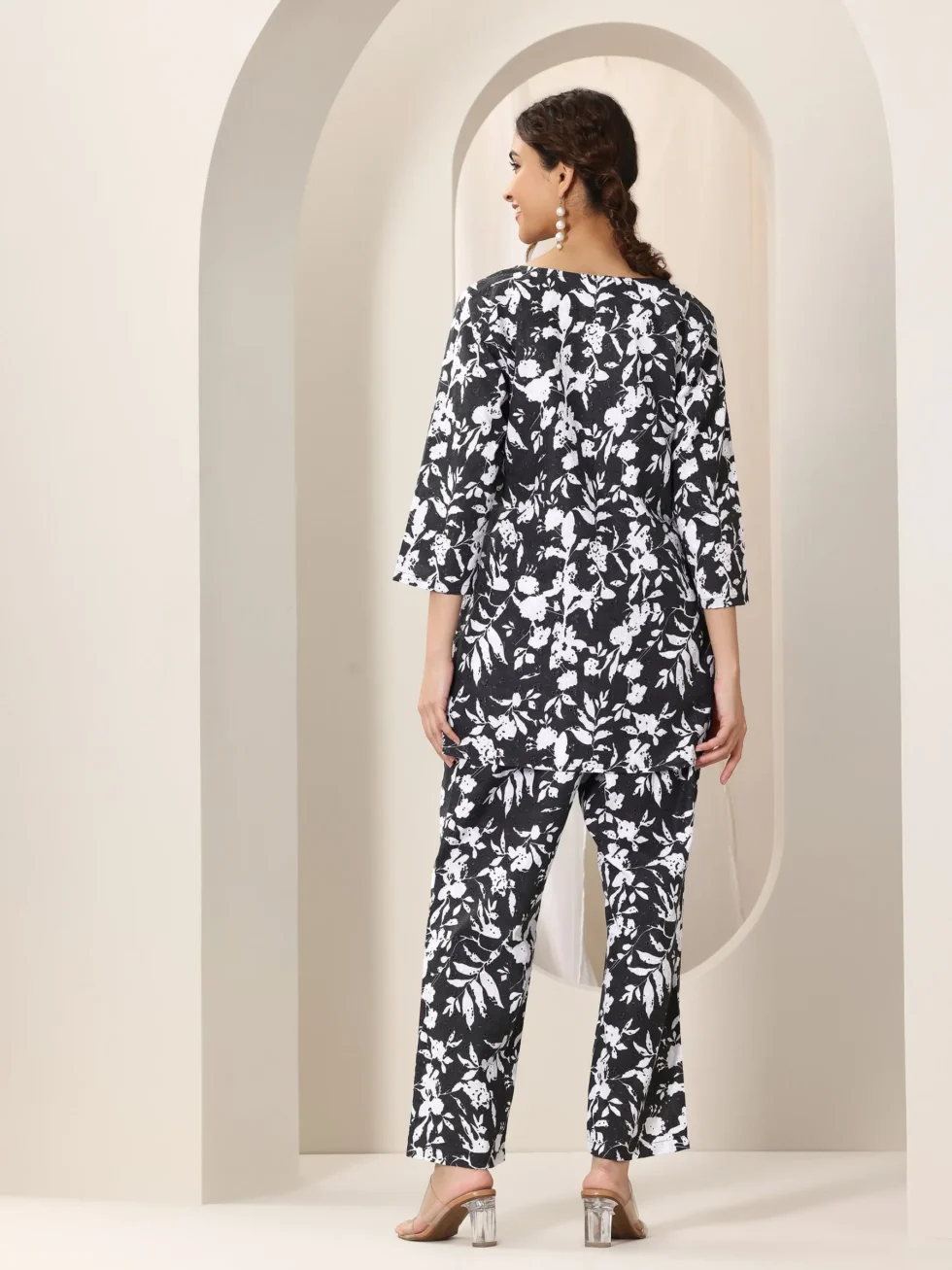 Our 2-piece black printed cotton co-ord set features a straight-fit kurta with a V-neckline and three-quarter sleeves. Complemented with matching straight pants with a partially elasticated waistband and roomy pockets. Highlighted with floral prints, this style is ideal for casual outings.