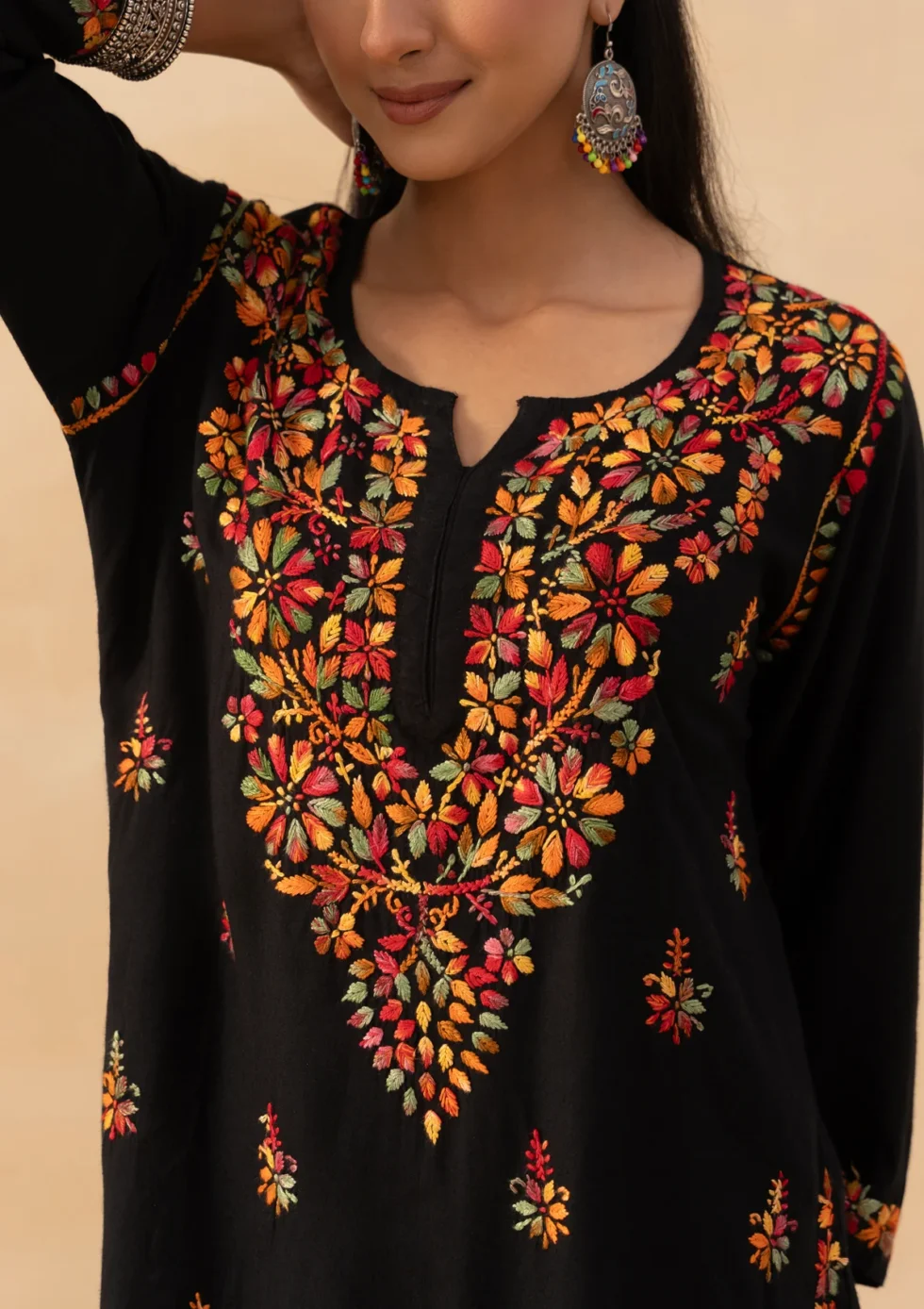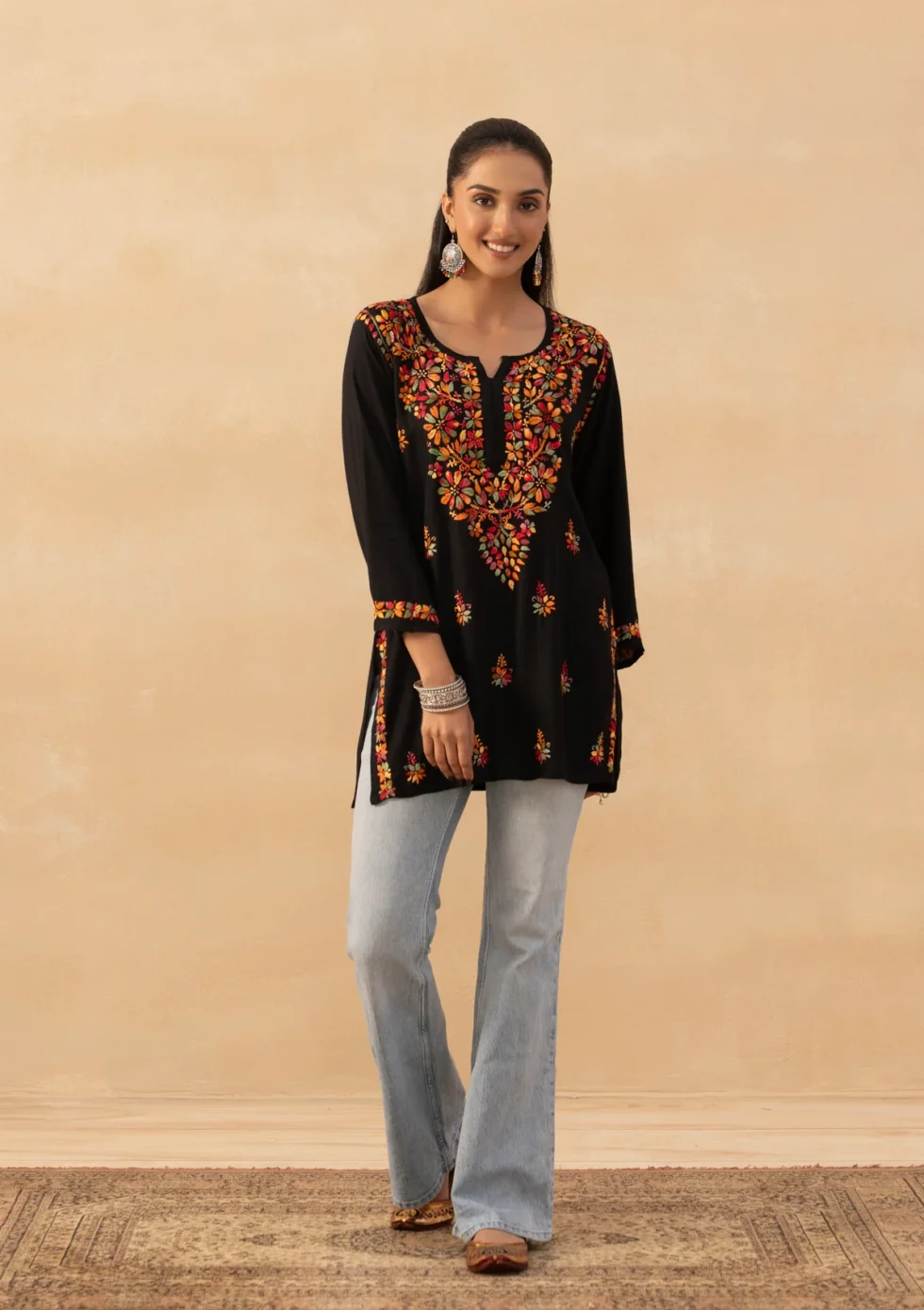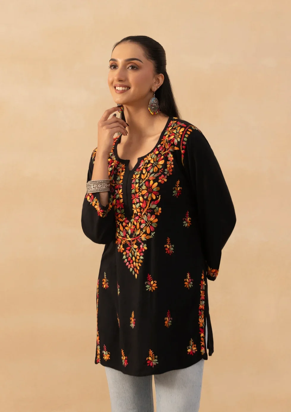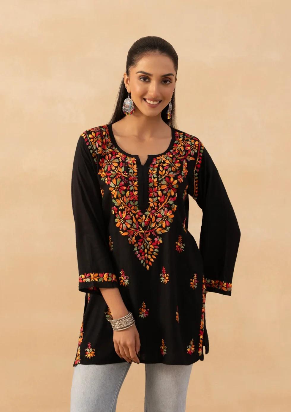 Rayon Chikankari Solid Short Kurta in black is crafted from soft rayon fabric for all-day comfort. The elegant chikankari work adds a refined ethnic touch.